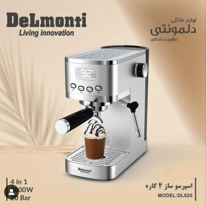 اسپرسوساز 4 کاره دلمونتی مدل DL620 با قدرت 2000 وات می باشد و قدرت بخار این دستگاه 20 بار بوده و با کنترل پنل دکمه ای همراه با صفحه نمایشگر است و با سیستم جوش آوری سریع برای عصاره گیری و فوم شیر غلیظ یک اسپرسو بسیار خوش طعم و عالی به ارمغان میارد .
