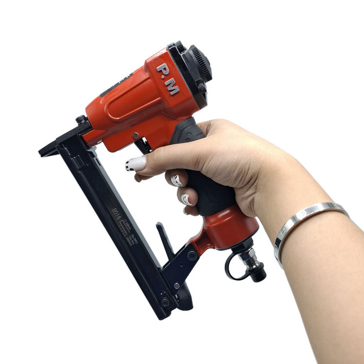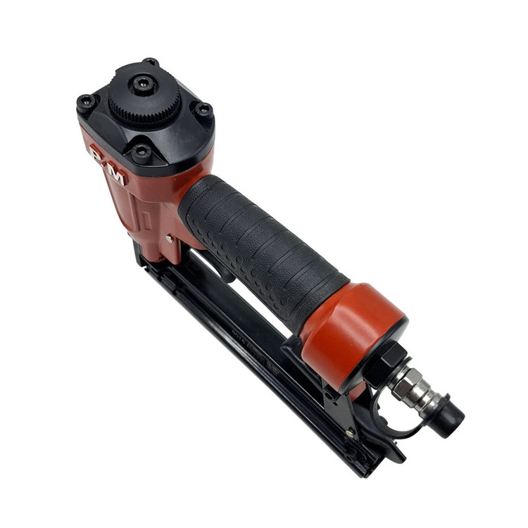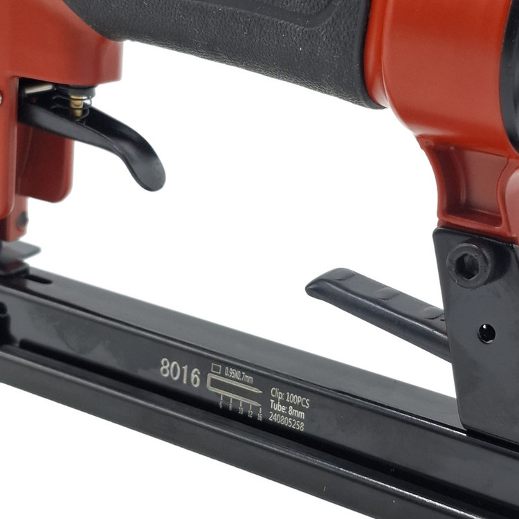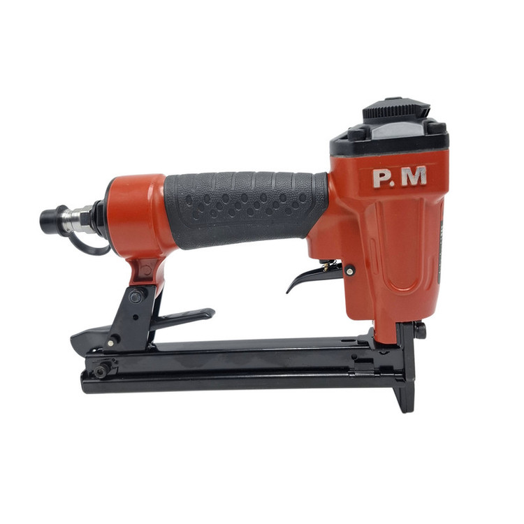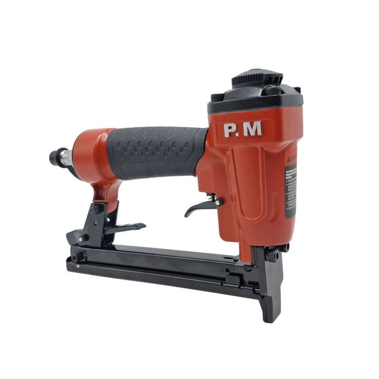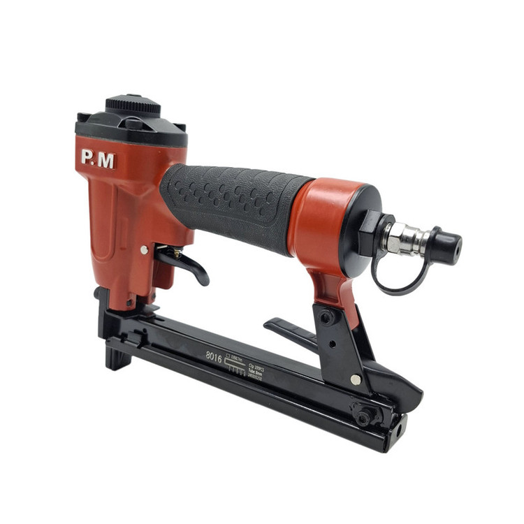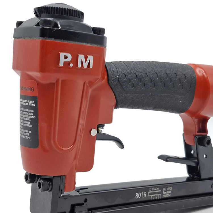 محصول فوق یکی از انواع دستگاههای منگنه کوب بازار است که انرژی مورد نیاز خود را از نیروی باد تامین میکند. منگنه کوب بادی مدل «80/16» نام دارد و شرکت «پی ام » آن را تولید میکند. برای کار با این دستگاه نیاز به کمپرسور دارید. نازل انتهایی دستگاه به خروجی کمپرسور وصل میشود و با کمک فشار باد، سوزن منگنه را به سطح مورد نظر پرتاب میکند. فشار باد خروجی از کمپرسور برای این دستگاه بهتر است در بازهی 100-60 پی اس آی قرار گیرد . خشاب این دستگاه 100عددی است و برای کار با آن میتوانید از سوزنهای منگنهای با ارتفاع پایهی 16-8 میلیمتر استفاده کنید. ضخامت پایه و تاج سوزن منگنه قابل استفاده در این دستگاه نیز باید به ترتیب مقادیری برابر 0.7× 0.95 میلیمتر و 8 میلیتر داشته باشند. این محصول از دستهای با روکشی نرم برخوردار است که مانع از خستگی دست کاربر در هنگام کار میشود.همچنین میتوان باد خروجی دستگاه را دلخواه در چهار جهت تعغیر داد.