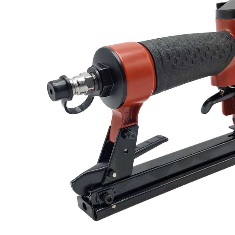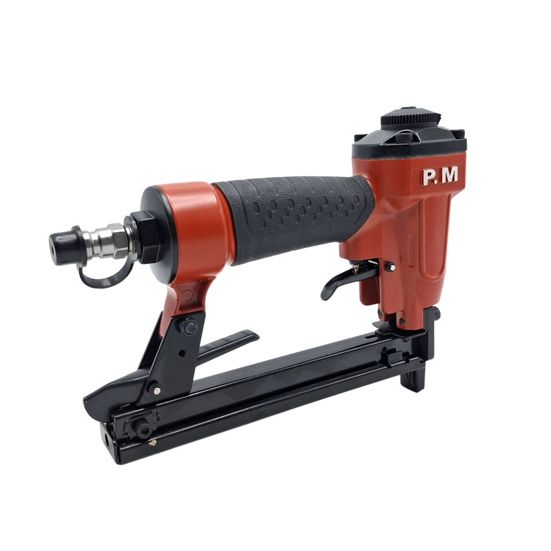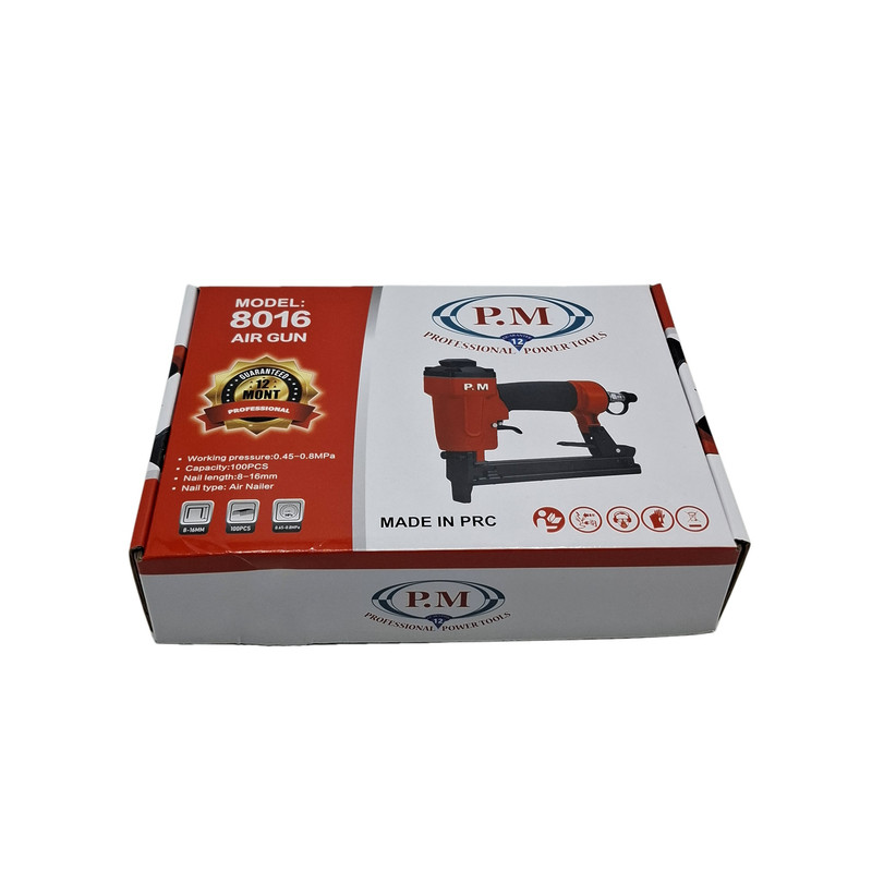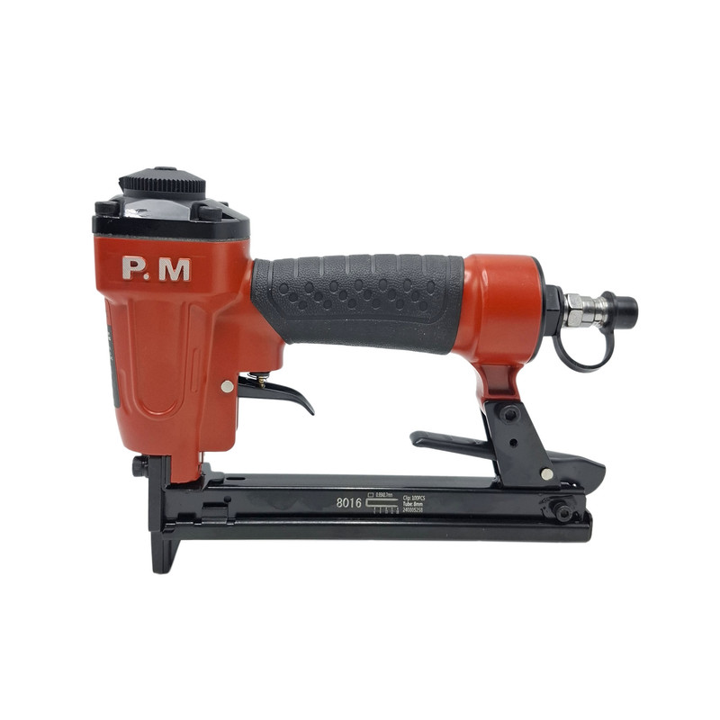 محصول فوق یکی از انواع دستگاههای منگنه کوب بازار است که انرژی مورد نیاز خود را از نیروی باد تامین میکند. منگنه کوب بادی مدل «80/16» نام دارد و شرکت «پی ام » آن را تولید میکند. برای کار با این دستگاه نیاز به کمپرسور دارید. نازل انتهایی دستگاه به خروجی کمپرسور وصل میشود و با کمک فشار باد، سوزن منگنه را به سطح مورد نظر پرتاب میکند. فشار باد خروجی از کمپرسور برای این دستگاه بهتر است در بازهی 100-60 پی اس آی قرار گیرد . خشاب این دستگاه 100عددی است و برای کار با آن میتوانید از سوزنهای منگنهای با ارتفاع پایهی 16-8 میلیمتر استفاده کنید. ضخامت پایه و تاج سوزن منگنه قابل استفاده در این دستگاه نیز باید به ترتیب مقادیری برابر 0.7× 0.95 میلیمتر و 8 میلیتر داشته باشند. این محصول از دستهای با روکشی نرم برخوردار است که مانع از خستگی دست کاربر در هنگام کار میشود.همچنین میتوان باد خروجی دستگاه را دلخواه در چهار جهت تعغیر داد.