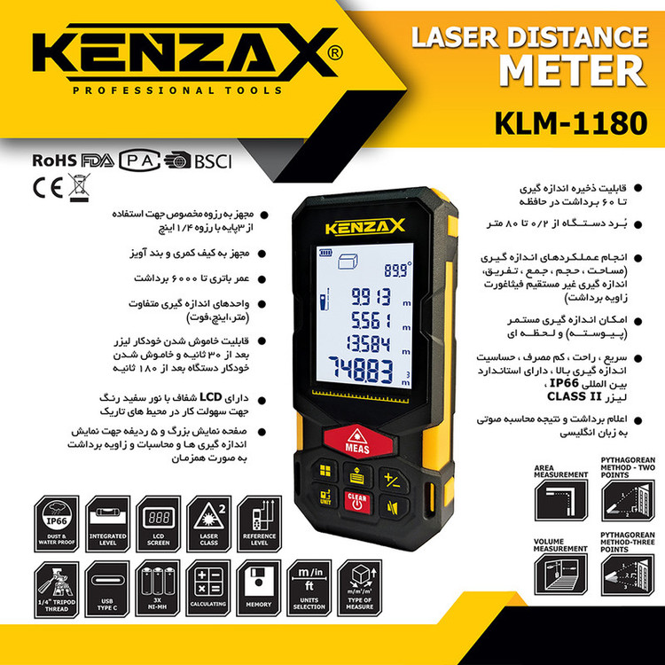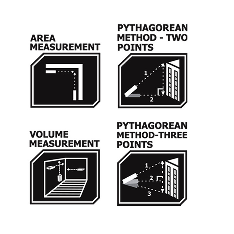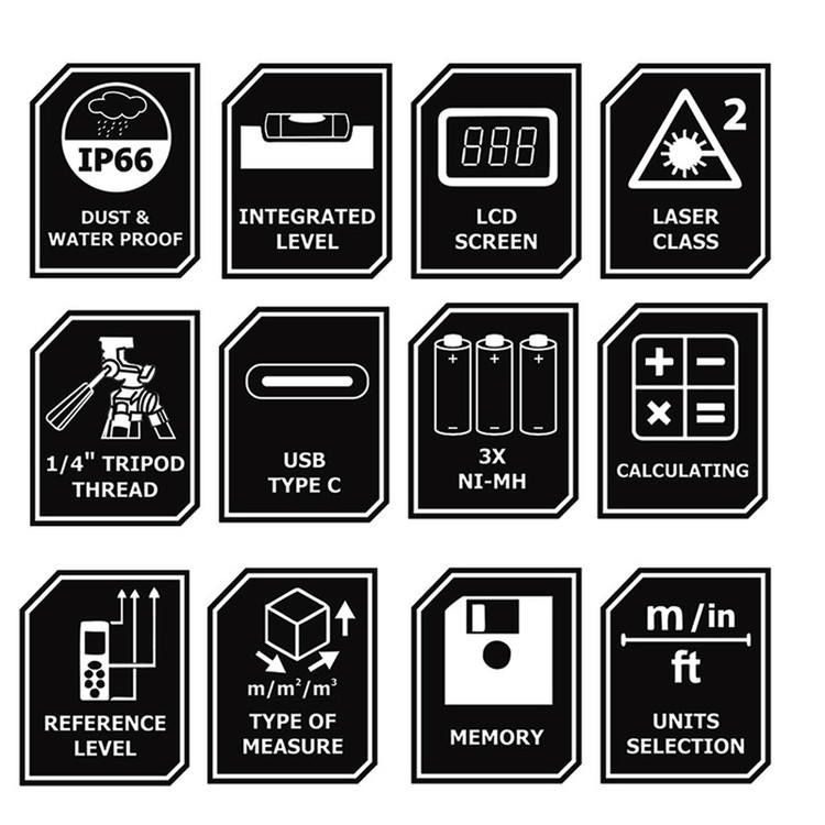 Class 2 , باتری نیمقلمی , قابلیت اندازهگیری حجم , قابلیت اندازهگیری زاویه , قابلیت اندازهگیری فاصله , قابلیت اندازهگیری مساحت , قابلیت خاموش شدن خودکار , واحد اندازهگیری اینچ , واحد اندازهگیری متر
